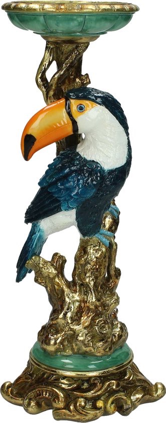 Breng de exotische pracht van de jungle in huis met deze unieke kandelaar, prachtig vormgegeven met een gedetailleerde toekan en luxe gouden accenten. Dit elegante decoratiestuk combineert natuur en kunst in een verfijnd design, perfect voor een stijlvol interieur.