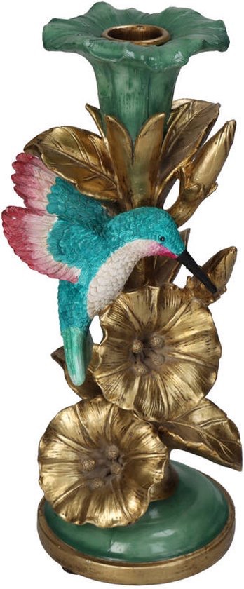 Vogel kandelaars zijn echt de trend van het moment. Deze kleurrijke kandelaar bevat gouden bloemen en een blauwe kolibrie.