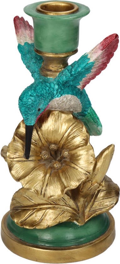 Deze kleurrijke kandelaar bevat gouden bloemen en een blauwe kolibrie. Lekker opvallend en trendy!