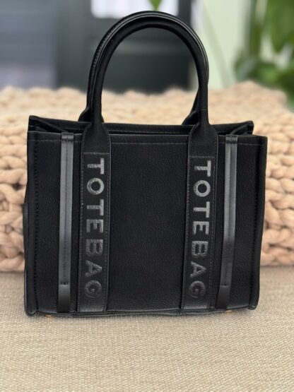 Kunstlederen handtas met ‘TOTE BAG’-tekst op de straps. Inclusief afneembare en verstelbare schouderriem. 3 binnenvakken (waarvan 1 met rits), zigzag voering en metalen noppen onderaan. Stijlvol en praktisch.